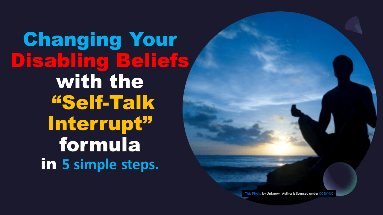 Your beliefs can be changed. You can start right now to change any limiting or disabling beliefs that are holding you back from creating the life you want. Use this practical and simple “Self-Talk Interrupt” formula to help you overcome any disabling beliefs that may be holding you back: